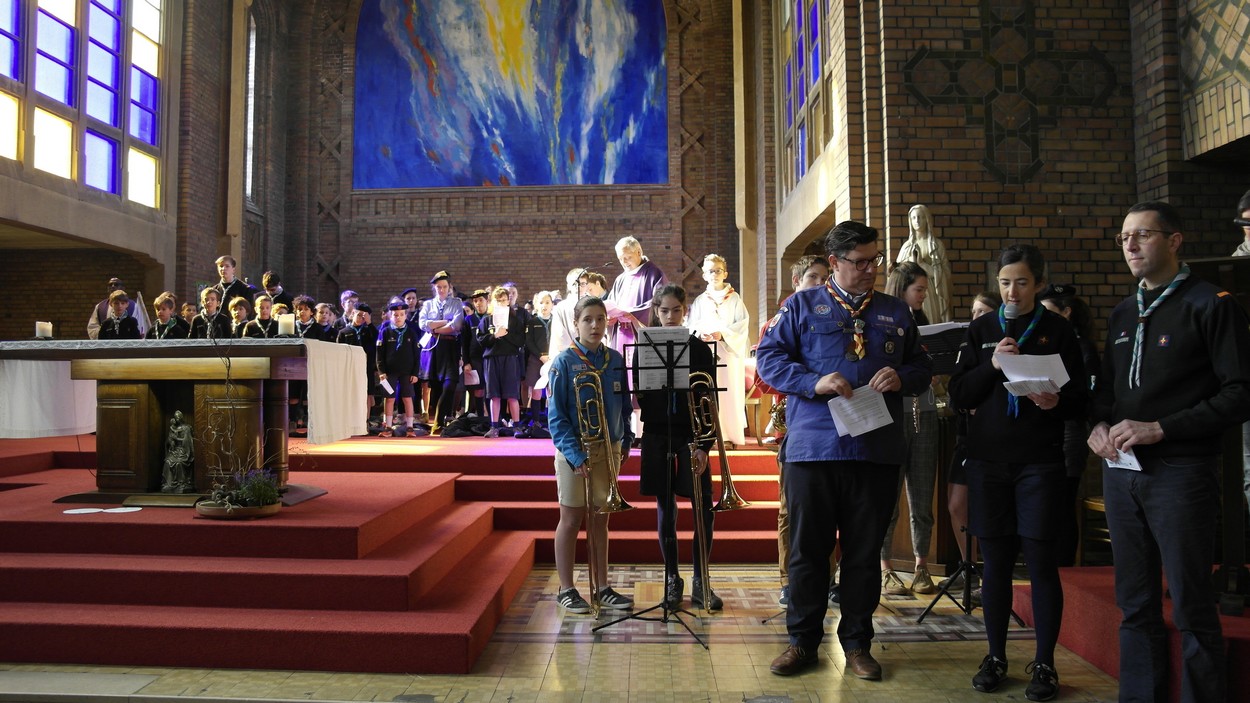 Après une très judicieuse présentation des différents mouvements (ce fut bien dit et clair, merci et bravo), l’Eucharistie pouvait commencer, entourée de nombreux servants de messe pour beaucoup portant le foulard scout … signe de la générosité et de l’esprit de service des différents troupes présentes ce jour. Mais aussi dans l’assemblée, à l’invitation du célébrant, bon nombre de paroissiens ont levé la main pour signifier qu’eux aussi ils avaient fait leur promesse… pour la vie ; ce qu’ils ont repris en chantant à la fin de la célébration. Moment émouvant d’ailleurs, plein de vérité et d’humilité à la fois. Des scouts, quoi !